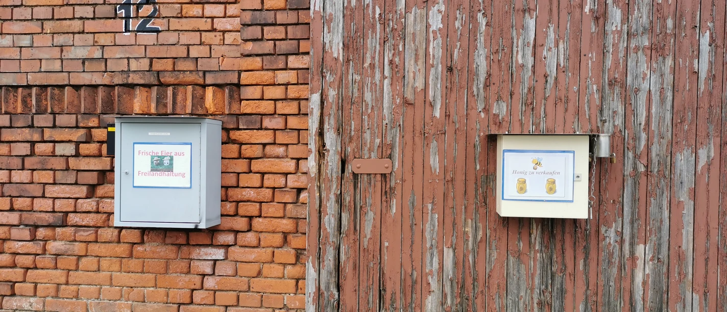 De kleine, rustieke boerderijwinkel is ondergebracht in twee stalen kasten die aan de muur van het huis hangen. Een ervan verkoopt eieren van scharrelkippen. En wat voor eieren. Het zijn verschillende maten en verschillende kleuren. Er zijn hier ook groene eieren buiten de paasperiode.