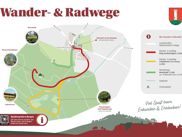 De historische informatie over de Domäne Rotenkirchen, het Amtsschreiberhaus, het Gasthaus Rotenkirchen, de Wildmeisterei, de Schweizerei en de Burg Grubenhagen, kunt u vinden op het informatiebord.