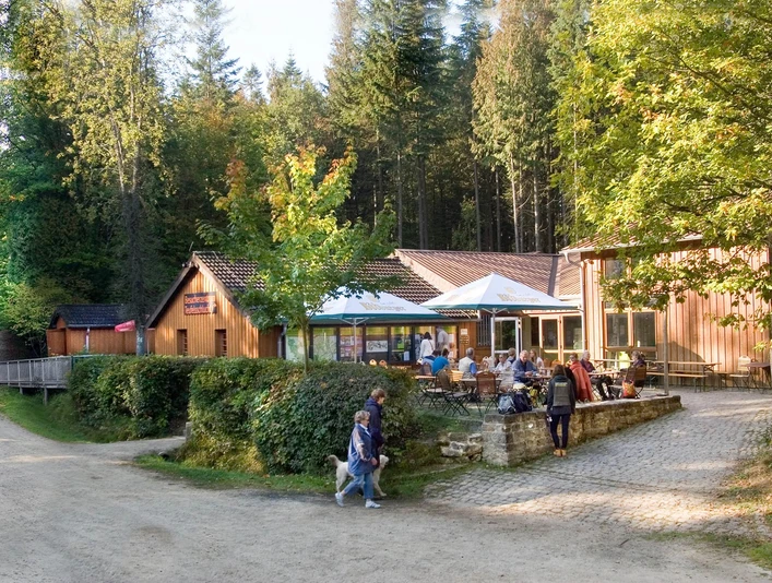Met zijn natuurparkmuseum, toeristisch informatiepunt en bistro met bosterras is het Naturparkzentrum Teufelsschlucht in het Naturpark Südeifel (natuurpark Zuid-Eifel) het ideale uitgangspunt voor rondleidingen door de rotswereld rond de Teufelsschlucht (Duivelskloof).