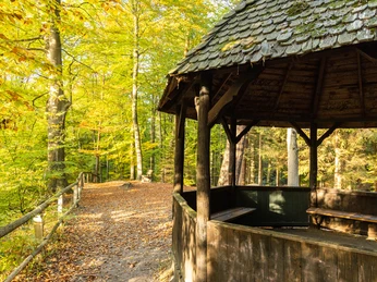 Een schuilhut met banken dient als rustplaats voor wandelaars en trekkers.
