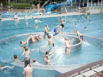 In het aangrenzende buitenbad is het zwemmersbad bekleed met roestvrij staal en is er een stromingskanaal geïnstalleerd. Er is ook een nieuwe kinderspeelzone met peuterbad, kleine glijbanen, enz.