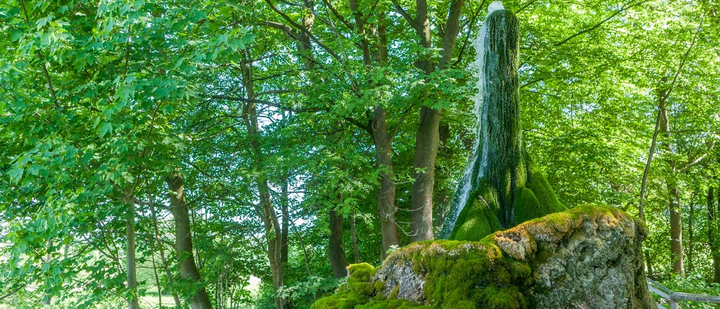 De kalk slaat uit het zeer kalkrijke water neer wanneer het in contact komt met de lucht en wordt in grote hoeveelheden als kalktufsteen op de overloop afgezet en ook mossen koloniseren het. Als gevolg hiervan heeft deze overloop nu het merkwaardige uiterlijk van een hoge, met mos bedekte boomstronk met water dat uit de bovenkant gutst.
