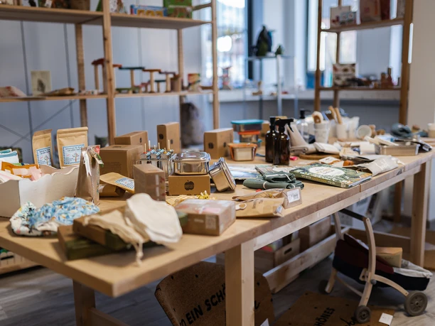 Het tweede deel van de winkel, SchlingelLiese, verkoopt houten speelgoed en duurzame accessoires voor kinderen en baby's.