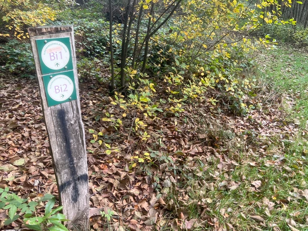 Het pad is gemarkeerd met groene en witte borden met de inscriptie Bi2.