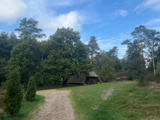 De tocht voert door het Bispinger Heidepark en langs de schaapskooi.