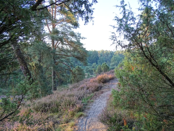 Aan het begin van de tocht loop je over smalle zandpaden langs de rand van een extreem steile vallei. De hellingen van deze spectaculaire daluitsnijding, ontstaan door smeltwaterstromen aan het einde van de laatste ijstijd, zijn bijzonder dicht begroeid met heide en jeneverbes. Het pad gaat verder door een beschermend loofbos, op een stuk met zoveel hellingen dat je zeker niet had verwacht op de Lüneburger Heide! Een bijzonder mooi stuk door de ongerepte jeneverbesheide verzacht de nu volgende klim terug naar het beginpunt van de tocht.
