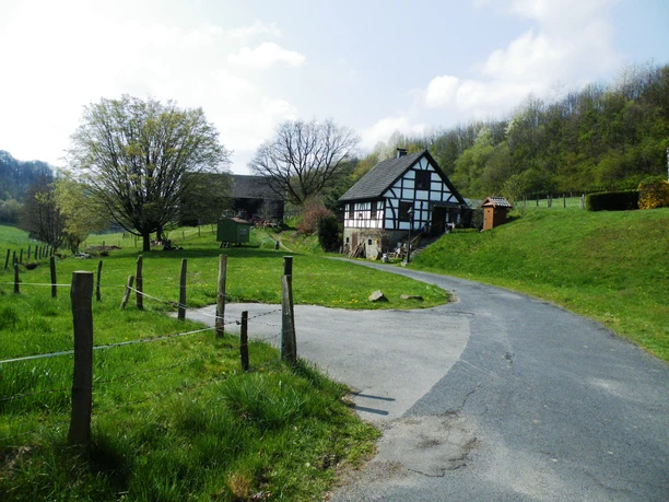 Bij de splitsing van de veldweg gaan we linksaf, tussen weilanden met afzettingen door, tot bij een oude schuur, daar gaan we links om het gebouw heen. We hebben Endringhausen bereikt. We lopen langs een mooi vakwerkhuis met stenen sokkel, houden rechts aan en volgen de weg de heuvel op, langs een boerderij. Blijf de weg volgen tot de volgende splitsing. Hier, aan de linkerkant, is Wuppertaler Hof (www.hotel-wuppertaler-hof.de), een mooie gelegenheid om te stoppen voor een pauze.