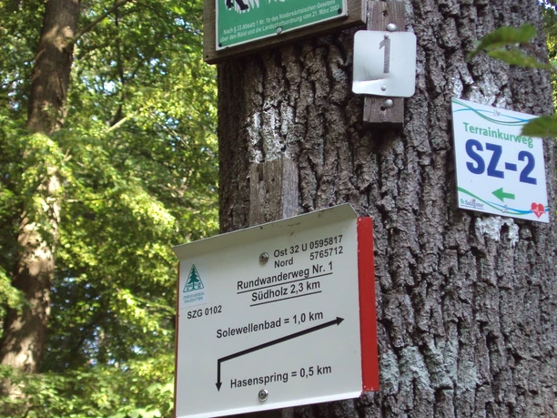 Het startpunt is de parkeerplaats achter het kuuroord Salzgitter-Bad. Bij de ingang van het bos ligt een grote overzichtskaart van de wandelroutes in het zuiden van Salzgitter. Een breed bospad markeert hier het begin van talrijke wandelingen. Na een paar stappen op het hoofdpad bereik je de Apothekerwinkel met bankjes. Er zijn verschillende kleine moerasbiotopen, typische soortenrijke flora en zeldzame planten. De gebouwen van Salzgitter-Bad zijn herkenbaar tussen de bomen en struiken in het noorden. De rondwandeling gaat nu een paar meter verder het bos in en buigt al snel af naar links. In een wijde bocht volgt de route een brede weg door de Südholz langs het bosrestaurant Hasenspring naar de Birkenweg. Sla linksaf deze weg in. Aan het einde sla je linksaf bergopwaarts de Bismarckstraße in tot je de thermen bereikt aan de linkerkant van de weg "Parkallee".