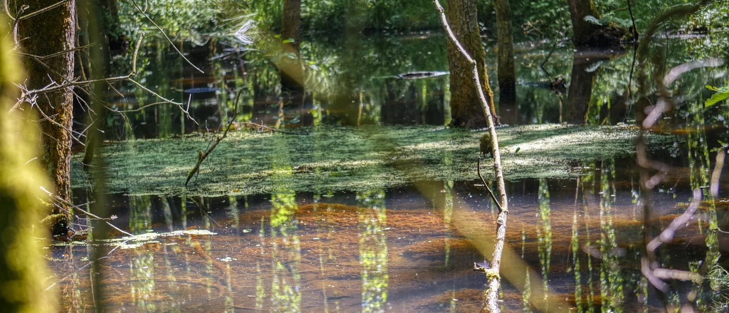 De ingang verraadt al dat deze lus een geheime tip is. Na een paar meter door een schaduwrijk gemengd bos voert de tocht langs een smal stuwpad door het midden van het brongebied, dat afhankelijk van het seizoen betovert met de schittering van ontelbare groentinten, goudgele herfstkleuren of het stille gekabbel van verschillende waterlopen onder het ijs. Onmiddellijk na het stuwmeerpad gaat het pad als een smal pad de steile helling op en vanaf de droge rand van de helling heb je een prachtig uitzicht op het daaronder gelegen elzenmoerasbos, doorkruist met poelen en beekjes. Een bijzondere attractie van deze tocht is de ongereptheid van het pad. Op sommige plaatsen kun je je bijna niet voorstellen dat er een uitweg is uit dit schijnbaar ongerepte struikgewas... Maar: na een afdaling door een klein sparrenbos aan het einde van de tocht helpt een plankbruggetje je weer op het wandelpad te komen dat je al kent van het begin van de tocht.