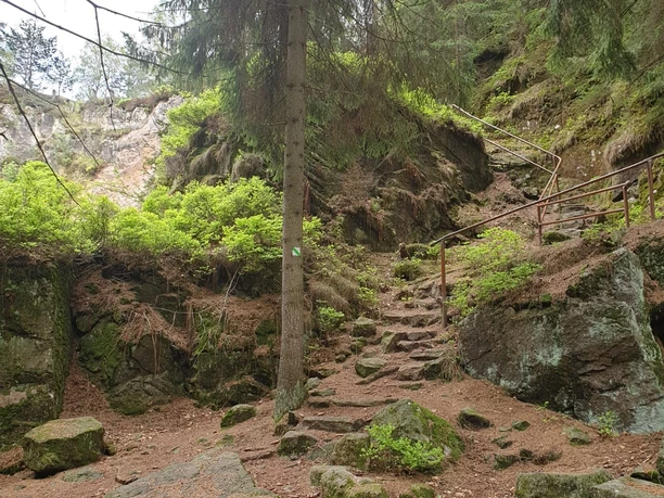 Die Tour startet am Parkplatz vom Gebirgsbad in Jonsdorf. Die Tour folgt dem Roten Punkt auf der Hainstraße (K8651) in Richtung Süden bis zum Holsteinweg. Zum Kroatzbeerwinkel muss hier auf den Grünen Punkt abgebogen werden und die Tour führt weiter in südliche Richtung zur nächsten Waldkreuzung. Von hier aus folgt die Tour dem Roten Strich bis zum Kellerbergbruch. Nun befindet man sich direkt in den Mühlsteinbrüchen und folgt ab hier dem Lehrpfadzeichen. Vom Kellerbergbruch aus ca. 60 m in Richtung Nord-Osten gelangt man zum Felsgebilde „Taube“ – oberhalb des Weißen Bruches. Hier ist auch ein überdachter Rastplatz vorhanden und am Rastplatz vorbei und nach ca. 30 m hat man eine Aussicht auf einen Teil von Jonsdorf und den Jonsberg. Nun geht es das kurze Stück zurück und weiter zur Steinbruchschmiede. In ihr wurden die Werkzeuge der Steinbrecher aus den vier Brüchen vorgerichtet. Wer möchte, kann einen kurzen Abstecher zum Schnapslager machen, eine ehemalige Hütte, von der noch die steinernen Wände stehen. Von der Steinbruchschmiede aus in Richtung Westen zum Schaubergwerk Schwarzer Bruch erreicht man einen ebenen Platz, der zu Steinbruchzeiten der Unterstellplatz für die Pferde genutzt wurde, die für den Transport der Mühlsteine gebraucht wurden. Einen ca. 80 m langen Abstecher kann man begehen, um von oben an der Nordwand in den Schwarzen Bruch zu schauen. Weiter auf dem Lehrpfad führt die Tour zum Schwarzen Bruch, den man über die Westseite erreicht. Der Schwarze Bruch (Schaubergwerk) selbst ist verschlossen, man kann ihn nur mit einer Führung direkt begehen, aber der Lehrpfad führt um ihn herum und über Naturstein- Treppen gelangt man an die Südwand, so dass man auch von hier wieder von oben in den Bruch hineinschauen kann. Weiter führt die Tour auf den Orgelsteig, auf dem man bald nach dem Schwarzen Bruch die Felsgebilde „Nashorn“ und „Berhardiner“ sowie noch ein Stück weiter den „Löwen“ entdecken kann. Der Orgelsteig führt die Tour weiter bergauf zu seinen namensgebenden Felsgebilden – die Kleine und die Große Orgel. Wieder ein Stück weiter in Richtung Süden, trifft die Tour auf den Alpenpfad, dem sie folgt. Auf dem Alpenpfad bergab kann man den „Dackel“, die „Teekanne“ und den „Zwerg“ entdecken. Am Ende des Alpenpfades begegnen wir einem aus Holz geschnitzten Uhu und dem Hochwaldmännlein. Auf dem Rückweg folgt die Tour ab hier dem Grünen Punkt, passiert das Gelände der Jonsdorfer Waldbühne oberhalb und trifft auf die Wegkreuzung mit dem Blauen Strich. Dem Blauen Strich folgt die Tour über den alten Sportplatz auf den Holsteinweg und zurück zum Parkplatz.