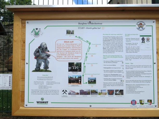 Auf jeder Tafel spricht ein Maulwurf (gekleidet wie ein Wismut-Bergmann), gewissermaßen ein Untertagearbeiter von Natur aus, die Kinder direkt an und hilft ihnen, Informationen zu finden und zu verstehen. Auch direkte Spuren des Bergbaus in der Region kann man unterwegs entdecken.