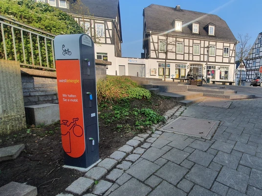 Die E-Bike Ladestation am Kirchplatz in Bad Fredeburg ermöglicht das simultane Laden von bis zu sechs E-Bikes, Mobiltelefonen oder Tablets. Drei der Ladefächer sind gesichert und bieten jeweils eine Doppelsteckdose sowie LED-Beleuchtung. Eine externe Kabelführung erlaubt zudem das direkte Laden am E-Bike.