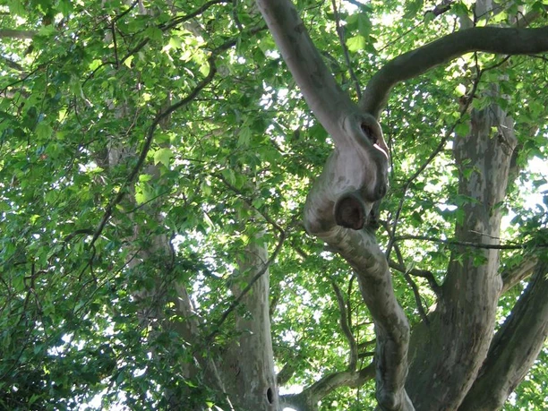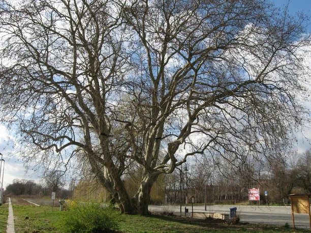 Die Platane ist in ihrem Aufwuchs ein besonderer, fast einmaliger Baum. Sechs fast bodennah ansetzende Stämmlinge bilden eine sehr hohe und weit ausladende Baumkrone.