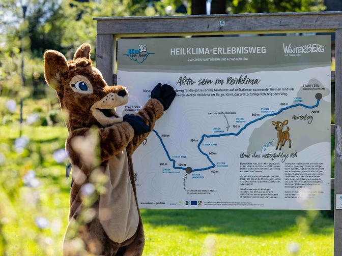 Klimi! Der Name ist Programm. Denn Klimi ist nicht nur ein ziemlich süßes Rehkitz, es spielt auch die Hauptrolle auf dem neuen Heilklima-Erlebnisweg, denn es leitet die Wanderung. Klimi on Tour lautet der Titel dieses Weges, der zwischen dem Kur- und Vitalpark Winterberg, durch das Skiliftkarussell Winterberg und am Nordhang vorbei auf den Kahlen Asten bis zum Haus des Gastes in Altastenberg verläuft und aus beiden Richtungen begehbar ist. Auf den ca. 9 km ist besonders das gesunde Reizklima in den Vordergrund gestellt. Spannende Stationen wie die Slackline oder das Wasserspiel an der Lennequelle lassen keine Langeweile aufkommen. Der Heilklima-Erlebnisweg spricht sowohl Familien mit Kindern als auch Wanderer und Klima-Interessierte an. Ob den ganzen Weg wandernd, über die Zwischeneinstige Lenneplätze oder Bremberg kommend oder aber zufällig darauf stoßend die Stationen sind verständlich und Körper und Geist anregend, denn das Thema Heilklima darf in einem heilklimatischen Kurort nicht fehlen.
