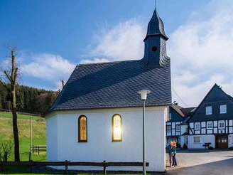Jetzt wandern Sie immer entlang des Rarbachs und im weiteren Verlauf entlang der Henne bis nach Herhagen. Dort treffen Sie wieder auf die Hauptroute des Kapellenweges und können ihre Wanderung auf diesem fortsetzten. Im Ort finden Sie die St. Laurentius Kapelle, welche direkt neben dem Geburtshaus von Christine Koch steht, die bekannt für ihre Gedichte in Sauerländer Mundart ist.