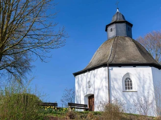 Wandern Sie nun ein Stück oberhalb von Nichtinghausen auf halber Höhe über dem Ort entlang. Sie treffen auf den Ortswanderweg Re1 und folgen Sie diesem über die Bergkuppe in Richtung Erflinghausen. Auf dem alten Totenweg wandern Sie langsam hinab nach Erflinghausen, wo Sie mitten im Ort zu der sechseckigen St. Lucia Kapelle kommen.