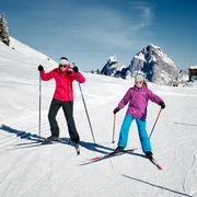 Ein knapper Fussmarsch vom Bahnhof in Richtung Alpthal führt uns in das Startgebiet der Loipen Bolzberg-Trachslau. Gleich beim Loipeneinstieg Grotzenmühle befindet sich der Nordic Shop mit Skivermietung und Garderobe, die Schweizer Langlaufschule Einsiedeln und ein Loipenbeizli. Von da aus teilt sich das Langlaufgebiet in zwei Strecken und umfasst total 25 Loipenkilometer inklusive Nachtloipe. Die 10 Kilometer lange und meist flache Sonnenloipe führt vorbei am Frauenkloster Au und über Wiesen nach Trachslau wo das Rest. Tändli zum Verweilen einlädt. Wer’s etwas hügeliger mag, kann sich sicher für die 11 Kilometer lange Bolzbergloipe begeistern. Bereits nach zwei Kilometern bietet sich uns eine wunderbare Aussicht auf die barocke Klosterkirche Einsiedeln und den in der Ferne schimmernden Sprungschanzen.