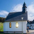 Wir wandern nun hinab zur Dorfmitte des Ortes Berge. An der Olper Straße biegen wir nach rechts in die Straße "Zur Küchenhelle" ein und überqueren die Wenne. Vor dem großen Holzlagerplatz gehen wir nach rechts durch den "Jüppkenpark" bis zur Fahrstraße (L 840) nach Meschede. Der Fahrstraße folgen wir etwa 30 m nach links und gehen dann wieder nach links den neuen Berger Kreuzweg hinauf bis zur Wanderwege-Kreuzung "Am Halloh". Hier treffen wir auch auf die Abkürzungs-Wanderwege (m) aus Richtung Oesterberge - Calle und Oesterberge - Wallen. Die Kapelle (weitere Info >>) an diesem Kreuzungspunkt weist auf die lange kulturgeschichtliche und religiöse Bedeutung dieses Ortes hin.