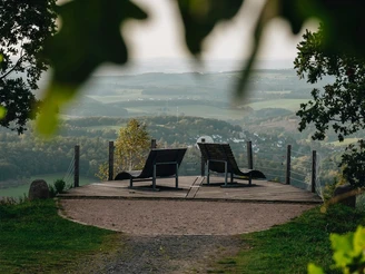 Von Irmgarteichen wanderst du über den gelb markierten Zugangsweg auf den Rothaarsteig-Hauptweg. Der nächste Zielpunkt ist wiederum eine Quelle: Die Dill ist ein 55 Kilometer langer Zufluss der Lahn und bildet die natürliche Grenze zwischen hessischem Westerwald und Lahn-Dill-Bergland. Auf Haincher und Gernsbacher (523 m) folgt nun die Tiefenrother Höhe (551m). Hier kannst du auf der Aussichtsplattform "Nase im Wind" eine spektakuläre Aussicht oder atemberaubende Sonnenuntergänge genießen.