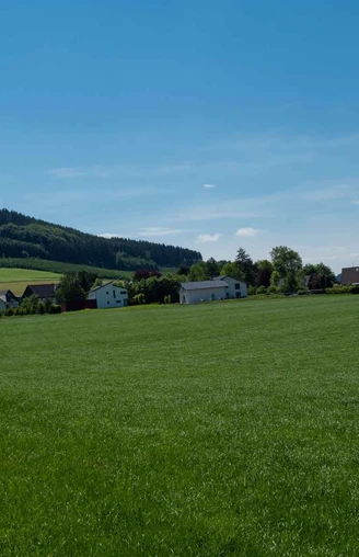 Nach einer gestreckten Rechtskurve gabelt sich der Weg erneut. Wir folgen dem Re3 links in das Wäldchen hinein. Am Ende des Waldweges biegen wir nach rechts auf den Teerweg, der in Richtung Lumberg führt. Ein kurzes Stück weiter öffnet sich vor uns ein grandioser Ausblick über das Wennetal bis tief in die Homert hinein. Wir bleiben stehen und genießen. Dann gehen wir weiter den Teerweg entlang. Nach etwa einem halben Kilometer trennt sich der SHF nach links von unserer Route.