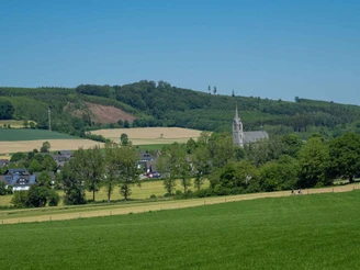 Der Sauerland-Höhenflug läuft jetzt ein ganzes Stück parallel zu dem Re3. An der Fußgängerampel überqueren wir die B55 und gehen durch einen kleinen Park mit alten Kastanien, der sich vor der Pfarrkirche St. Pankratius befindet. In der Kirche befindet sich eine der Historischen Orgeln Westfalens, mit Registern aus dem 16. Jhd. Wir gehen in die Kirche hinein und schauen uns ein wenig um. Wieder draußen angekommen fällt unser Blick auf eine uralte Eiche, die einige Meter weiter am Weg steht. Weiter geht es auf dem Eikweg in Richtung Beisinghausen, vorbei am Hof Heinemann und der Bügelfabrik Mues.