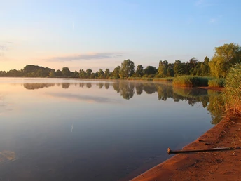 Hinter dem Campingplatz verläuft der Weg unmittelbar am Ufer des Losheimer Sees. Die Stille wird hier nur vom Quaken der Frösche oder dem Geschnatter der Enten unterbrochen.