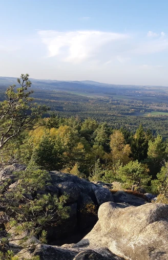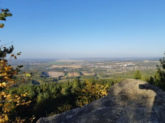 Von der höchsten Stelle des Aussichtspunkts aus können Wanderer dank der Rundumsicht den Blick über die Landschaft des Neißetals, des Lausitzer und Zittauer Gebirges, des Böhmischen Mittelgebirges sowie des Böhmischen Hügellands schweifen lassen, zu den Nachbarn nach Deutschland, wo sich das Lausitzer Becken ausbreitet, und auch nach Polen hinüber schauen. Bei gutem Wetter sind auch die Gipfel des Iser- und des Riesengebirges zu sehen. Von einer Stelle aus sieht der Besucher des Pfaffensteins auch die markanten Berge des Lausitzer Gebirges einschließlich des höchsten Gipfels Lausche, den Kegel des Kleis, den Hochwald sowie die Sandsteinfelsen in der nahen Umgebung. In der anderen Richtung entdeckt er das Wahrzeichen der Region Liberec, den Ještěd (Jeschken). Bei Blick in nördlicher Richtung sind die Tagebaue im benachbarten Polen nicht zu übersehen.